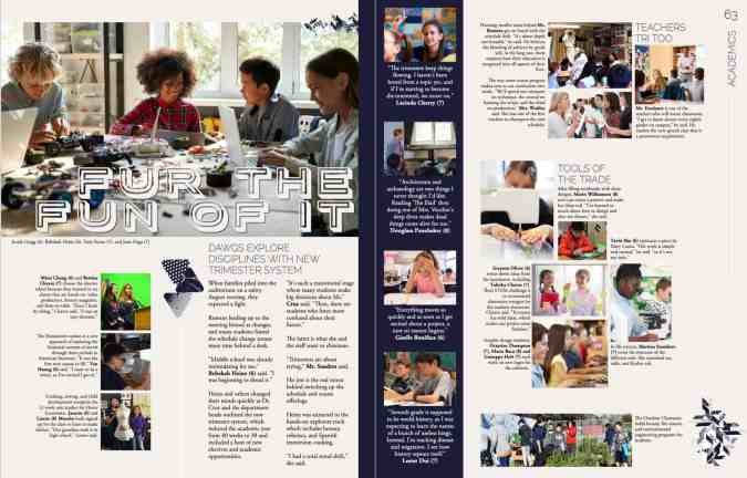 - Find new design ideas. It’s a lot easier to have your yearbook team work through design problems and find inspiration when you have some great examples sitting in the same room as with them. And we’re not just talking about spread designs. Other schools’ yearbooks can serve as a way to work through design issues related to everything, including mods, folios, and section breaks—with the added benefit of seeing how those designs complemented theme development, were used as templates throughout the book, etc..