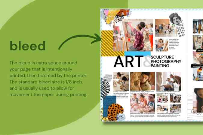 - Bleed: extra space around your page that is intentionally printed, then trimmed by the printer. The standard bleed size is 1/8 inch, and is usually used to allow for movement the paper during printing.