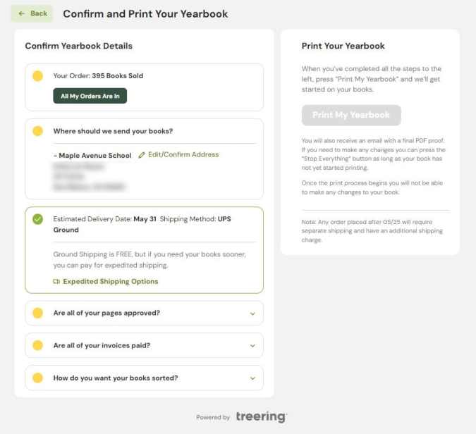 You tell Treering when to begin the printing process. When your Finish Editing Yearbook Deadline arrives, your yearbook does not automatically head to the printers. Remember, your three-week turnaround begins from the date you send the book to print.