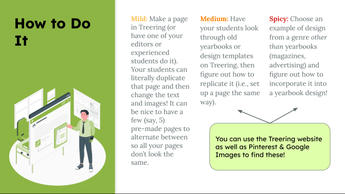 In my credential program, I missed the comprehensive graphic design, marketing, journalism, editing and proofreading, photojournalism, contract negotiation, and volunteer management track that would prepare me to be a yearbook educator. Over the years, an idea library on my classroom shelves slowly came about: other school's yearbooks, folders of magazine spreads worth emulating, Treering's Big Idea Book and Marketing Un-Stumped, plus gobs of digital files. If your yearbook advising journey is relatable, try these small changes that will make an impact on your book's visual look.