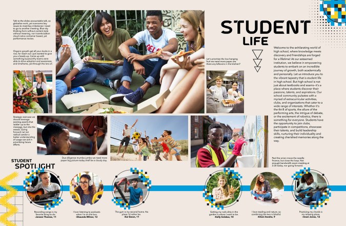 Crafting a digital book that looks handmade invites your school community into a world where thoughtfully placed captions and photographs tell your unique story. This intentional design choice ignites curiosity and captivates the senses. The scrapbook-like textures, imperfect lines, and off-the-grid layouts carry the essence of an artist's hands at work.